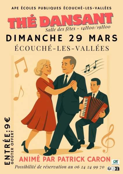 Date : Dimanche 29/03/2026 Horaires : 14h à 19h Tarifs : 9€ avec goûter offert Organisateur : APE ÉCOLES PUBLIQUES ÉCOUCHÉ-LES-VALLÉES Adresse de l'événement : SALLE DES FÊTES 61150 ECOUCHE LES VALLEES Informations complémentaires : Animation : Patrick Caron. Possibilité de réservation. Danses pratiquées : Danses de salon, Danses en ligne (Line dance), Danses rétro Référence de l'annonce : 64995 call06 24 24 99 70