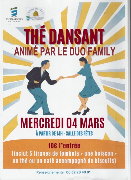 Date : Mercredi 04/03/2026 Horaires : 14h à 18h30 Tarifs : 10€ Adresse de l'événement : SALLE DES FÊTES PLACE DU 8 MAI 1945 84320 ENTRAIGUES SUR LA SORGUE Informations complémentaires : Animation : Duo Family. Musette et variété. Entrée incluant 5 tirages de tombola, une boisson, un thé ou un café accompagné de biscuits. Danses pratiquées : Danses de salon, Danses en ligne (Line dance), Danses rétro, Variété Référence de l'annonce : 64860 call06 52 28 40 81