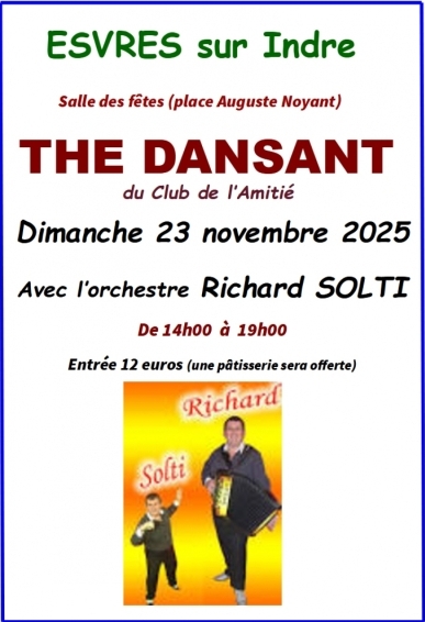 Date : Dimanche 23/11/2025 Horaires : 14h à 19h Tarifs : 12€ Organisateur : CLUB DE L'AMITIÉ Adresse de l'événement : SALLE DES FÊTES PLACE AUGUSTE NOYANT 37320 ESVRES Informations complémentaires : Animation : Orchestre Richard Solti. Une pâtisserie sera offerte à tous les participants. Danses pratiquées : Danses de salon, Danses en ligne, Danses rétro Référence de l'annonce : 53344 call02 47 26 52 29