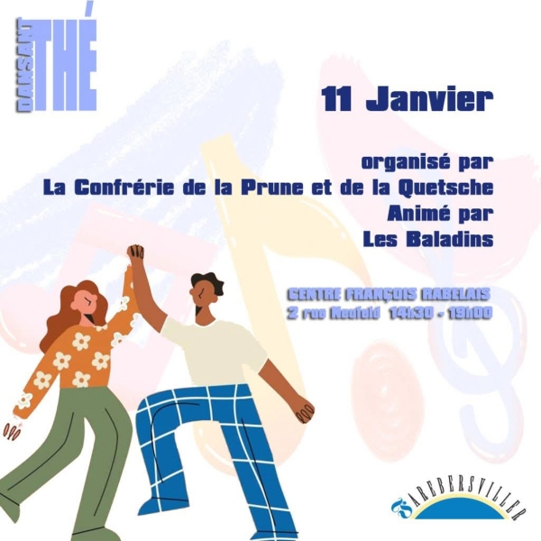 Date : Dimanche 11/01/2026 Horaires : 14h30 à 19h Tarifs : 7€ Organisateur : CONFRÉRIE DE LA PRUNE ET DE LA QUETSCHE Adresse de l'événement : CENTRE FRANÇOIS-RABELAIS 2 RUE DU NEUFELD 57450 FAREBERSVILLER Informations complémentaires : Animation : Les Baladins. Danses : valse, tango, madison, marche, rock. Ouverture des portes dès 14h. Point restauration avec café, gâteaux, boissons et casse-croûtes saucisses. Danses pratiquées : Danses de salon, Danses en ligne, Danses rétro, Madison, Rock, Tango, Valse Référence de l'annonce : 61136 call06 21 26 03 34