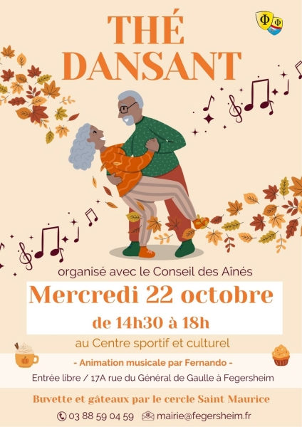 Date : Mercredi 22/10/2025 Horaires : 14h30 à 18h Tarifs : Gratuit Organisateur : MAIRIE DE FEGERSHEIM Adresse de l'événement : CENTRE SPORTIF ET CULTUREL 17A RUE DU GÉNÉRAL-DE-GAULLE 67640 FEGERSHEIM Informations complémentaires : Animation : Fernando. Avec la participation du Conseil des Aînés et du Cercle Saint-Maurice. Buvette et gâteaux proposés par le Cercle Saint-Maurice. Entrée libre toute l'après-midi. Danses pratiquées : Danses de salon, Danses en ligne, Danses rétro Référence de l'annonce : 53537 call03 88 59 04 59