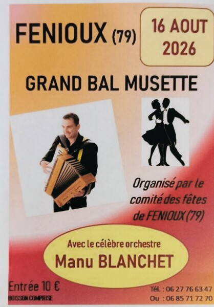 Date : Dimanche 16/08/2026 Horaires : A partir de 14h30 Tarifs : 10€ Organisateur : COMITÉ DES FÊTES DE FENIOUX Adresse de l'événement : 3 PLACE DE LA MAIRIE SALLE DES FÊTES 79160 FENIOUX Informations complémentaires : Grand bal musette à FENIOUX 79160 avec l'orchestre Manu BLANCHET.