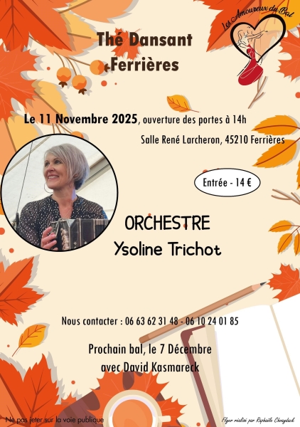 Date : Mardi 11/11/2025 Horaires : 14h Tarifs : Entrée 14€ Adresse de l'événement : SALLE RENÉ LARCHERON 45210 FERRIERES EN GATINAIS Informations complémentaires : Animation : Ysoline Trichot. Ouverture des portes à 14h. Prochain bal le 7 décembre avec David Kasmareck. Danses pratiquées : Danses de salon, Danses en ligne, Danses rétro Référence de l'annonce : 54230 call06 63 62 31 48call06 10 24 01 85