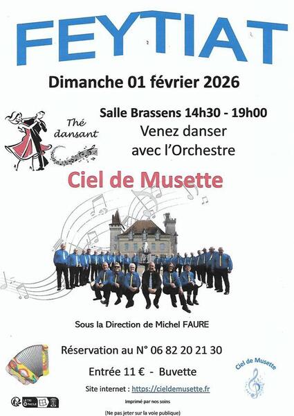 Date : Dimanche 01/02/2026 Horaires : 14h30-19h Tarifs : 11€ Adresse de l'événement : SALLE GEORGES-BRASSENS 87220 FEYTIAT Informations complémentaires : Animation : Orchestre Ciel de Musette sous la direction de Michel Faure. Buvette sur place. Danses pratiquées : Danses de salon, Danses en ligne (Line dance), Danses rétro Référence de l'annonce : 61791 call06 82 20 21 30