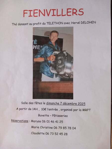 Date : Dimanche 07/12/2025 Horaires : 14h Tarifs : 10€ Organisateur : MRPT Adresse de l'événement : SALLE DES FÊTES 80750 FIENVILLERS Informations complémentaires : Animation : Orchestre Hervé Delohen. Au profit du Téléthon. Buvette et pâtisseries. Danses pratiquées : Danses de salon, Danses en ligne, Danses rétro Référence de l'annonce : 56292 call06 01 46 41 25call06 79 85 78 04