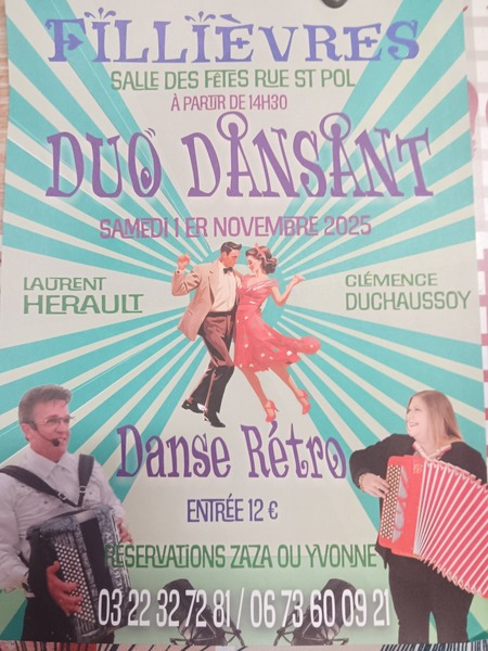 Date : Samedi 01/11/2025 Horaires : 14h30 Tarifs : 12€ Adresse de l'événement : SALLE DES FÊTES RUE SAINT-POL 62770 FILLIEVRES Informations complémentaires : Animation : Laurent Hérault et Clémence Duchaussoy (Duo Dansant). Danse rétro. Orchestre Laurent Hénault. Danses pratiquées : Danses de salon, Danses en ligne, Danses rétro Référence de l'annonce : 52681 call03 22 32 72 81call06 73 60 09 21