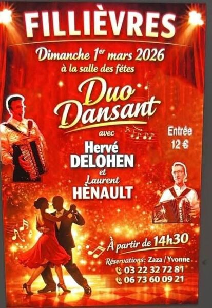 Date : Dimanche 01/03/2026 Horaires : 14h30 Tarifs : 12€ Adresse de l'événement : SALLE DES FÊTES 62770 FILLIEVRES Informations complémentaires : Animation : Duo Dansant Hervé Delohen et Laurent Hénault. Orchestre Laurent Hénault. Danses pratiquées : Danses de salon, Danses en ligne (Line dance), Danses rétro Référence de l'annonce : 62102 call03 22 32 72 81call06 73 60 09 21