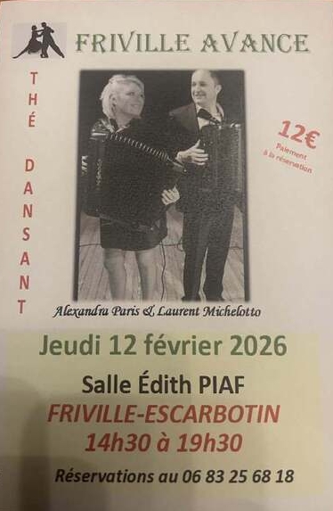 Date : Jeudi 12/02/2026 Horaires : 14h30 à 19h30 Tarifs : Entrée 12€ Organisateur : FRIVILLE AVANCE Adresse de l'événement : SALLE ÉDITH PIAF 80130 FRIVILLE ESCARBOTIN Informations complémentaires : Animation : Alexandra Paris & Laurent Michelotto. Paiement à la réservation. Danses pratiquées : Danses de salon, Danses en ligne, Danses rétro Référence de l'annonce : 61075 call06 83 25 68 18