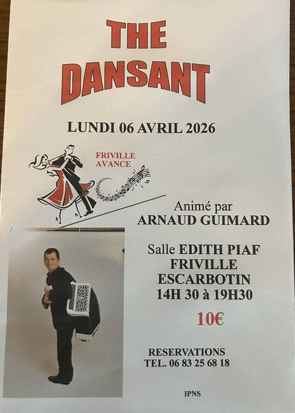 Date : Lundi 06/04/2026 Horaires : 14h30-19h30 Tarifs : 10€ Adresse de l'événement : SALLE ÉDITH PIAF 80130 FRIVILLE ESCARBOTIN Informations complémentaires : Animation : Orchestre Arnaud Guimard. Danses pratiquées : Danses de salon, Danses en ligne (Line dance), Danses rétro Référence de l'annonce : 65067 call06 83 25 68 18