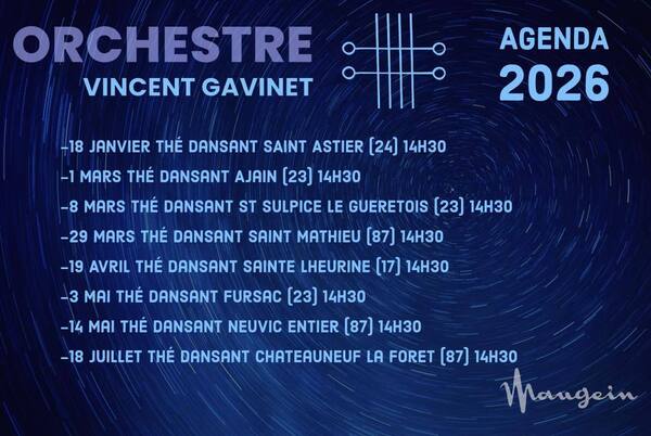 Date : Dimanche 03/05/2026 Horaires : 14h30 Adresse de l'événement : 23290 FURSAC Informations complémentaires : Animation : Orchestre Vincent Gavinet. Danses pratiquées : Danses de salon, Danses en ligne (Line dance), Danses rétro Référence de l'annonce : 62997