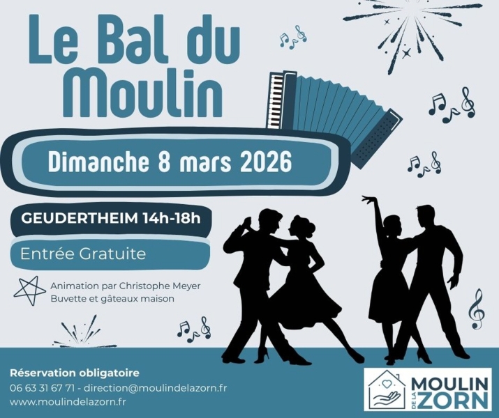 Date : Dimanche 08/03/2026 Horaires : de 14h à 18h Tarifs : Gratuit Organisateur : MOULIN DE LA ZORN Adresse de l'événement : MOULIN DE LA ZORN 15 RUE DU MOULIN 67170 GEUDERTHEIM Informations complémentaires : Animation : Christophe Meyer. Buvette et gâteaux maison. Réservation obligatoire. Danses pratiquées : Danses de salon, Danses en ligne (Line dance), Danses rétro Référence de l'annonce : 65072 call06 66 39 75 44call06 63 31 67 71