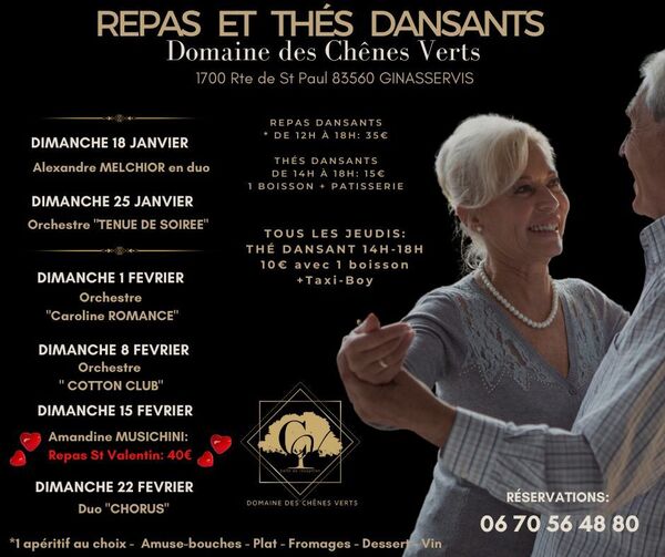 Date : Dimanche 15/02/2026 Horaires : 12h à 18h Tarifs : 40€ Adresse de l'événement : DOMAINE DES CHÊNES VERTS 1700 ROUTE DE SAINT-PAUL 83560 GINASSERVIS Informations complémentaires : Animation : Amandine Musichini. Saint-Valentin. Danses pratiquées : Danses de salon, Danses en ligne (Line dance), Danses rétro Référence de l'annonce : 61680 call06 70 56 48 80