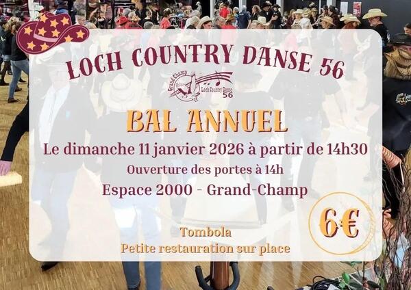 Date : Dimanche 11/01/2026 Horaires : 14h30 Tarifs : 6€ Organisateur : LOCH COUNTRY DANSE 56 Adresse de l'événement : ESPACE 2000 56390 GRAND CHAMP Informations complémentaires : Ouverture des portes à 14h. Tombola. Petite restauration sur place. Danses pratiquées : Country Référence de l'annonce : 55290