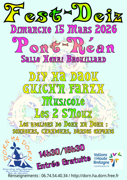 Date : Dimanche 15/03/2026 Horaires : 14h30 Tarifs : Gratuit Organisateur : DORN HA DORN Adresse de l'événement : SALLE HENRI BROUILLARD À PONT)-RÉAN GUICHEN 35580 GUICHEN Informations complémentaires : Avec la participation des groupes : Div Ha Daou, Guich N'Farzh,Musicole, Les 2 S'noux Danses pratiquées : Danse bretonne Référence de l'annonce : 65598 call06 74 54 40 34