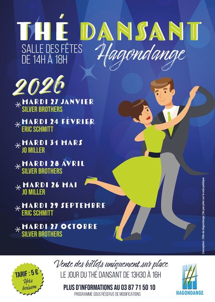 Dates : Mardi 31/03/2026, Mardi 28/04/2026, Mardi 26/05/2026, Mardi 29/09/2026, Mardi 27/10/2026 Horaires : 14h à 18h Tarifs : 5€ (hors boisson) Organisateur : VILLE D'HAGONDANGE Adresse de l'événement : SALLE DES FÊTES DU HAN RUE HENRI-HOFFMANN 57300 HAGONDANGE Informations complémentaires : 27/01/2026 : Animation "Silver Brothers"