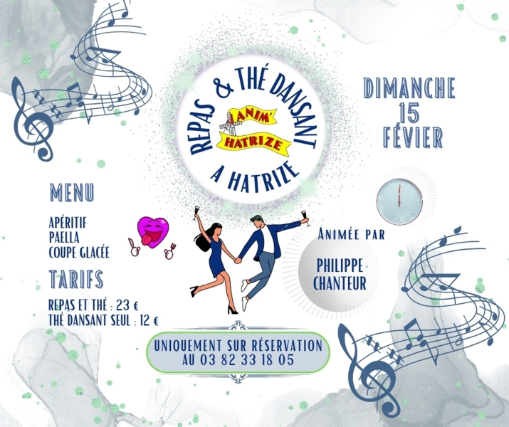 Date : Dimanche 15/02/2026 Horaires : De 12h à 18h Tarifs : 23€ avec repas, 12€ sans repas Organisateur : ANIM'HATRIZE Adresse de l'événement : SALLE DES FÊTES 1 RUE DU ROUVION 54800 HATRIZE Informations complémentaires : Animation : Philippe Chanteur. Menu : apéritif, paëlla, coupe glacée. Réservation obligatoire. Non conseillé aux enfants. Accès adapté aux personnes à mobilité réduite. Danses pratiquées : Danses de salon, Danses en ligne (Line dance), Danses rétro Référence de l'annonce : 62602 call06 62 62 43 65call03 82 33 18 05