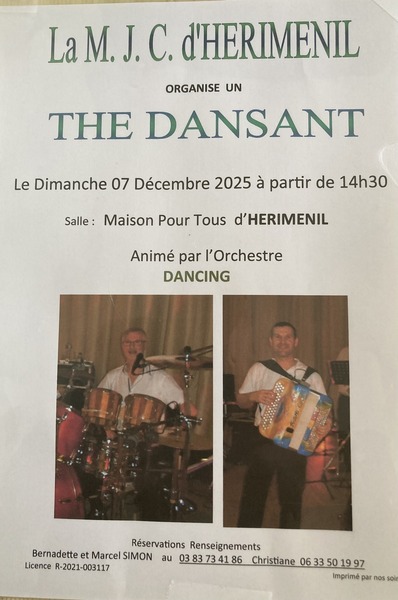 Date : Dimanche 07/12/2025 Horaires : 14h30 Tarifs : 10€ Organisateur : M.J.C. D'HÉRIMÉNIL Adresse de l'événement : MAISON POUR TOUS 27 AVENUE DU STADE 54300 HERIMENIL Informations complémentaires : Animation : Orchestre Dancing. Danses pratiquées : Danses de salon, Danses en ligne, Danses rétro Référence de l'annonce : 56943 call03 83 73 41 86call06 33 50 19 97