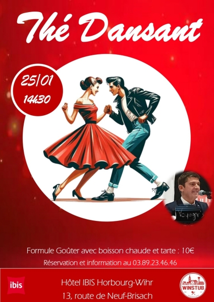 Date : Dimanche 25/01/2026 Horaires : 14h30 Tarifs : 10€ Organisateur : IBIS COLMAR EST Adresse de l'événement : HÔTEL IBIS COLMAR EST 13 ROUTE DE NEUF-BRISACH 68180 HORBOURG WIHR Informations complémentaires : Animation : Christophe Dreyfus. Boissons chaudes et tartes comprises. Formule goûter. Ambiance conviviale. Danses pratiquées : Danses de salon, Danses en ligne, Danses rétro Référence de l'annonce : 61235 call03 89 23 46 46