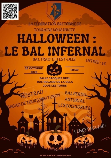 Date : Dimanche 26/10/2025 Horaires : 13h30 à 17h30 Tarifs : Entrée : 5€ Organisateur : FÉDÉRATION BRETONNE DE TOURAINE Adresse de l'événement : SALLE JACQUES BREL RUE ROLAND DE LA OLLA 37300 JOUE LES TOURS Informations complémentaires : Animation : Nostrad, Bal Perdu, Asturial, Bagad de Tours Bro Turon, Les Coccigrues. Bal trad folk et breton pour tous. Atelier maquillage. Buvette. Déguisement recommandé. Halloween. Danses pratiquées : Danse bretonne, Danse folklorique Référence de l'annonce : 53610
