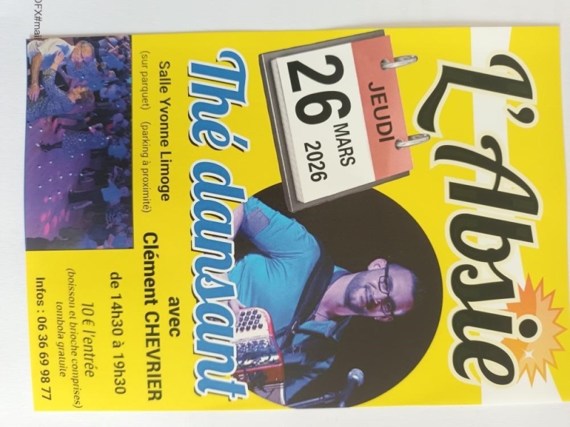 Date : Jeudi 26/03/2026 Horaires : 14h30 à 19h30 Tarifs : 10€, avec boissons, brioche et tombola gratuite Organisateur : LA GUINGUETTE DES PAS PRESSÉS Adresse de l'événement : SALLE YVONNE-LIMOGE 79240 L ABSIE Informations complémentaires : Animation : Clément Chevrier. Salle sur parquet. Parking à proximité. Danses pratiquées : Danses de salon, Danses en ligne (Line dance), Danses rétro Référence de l'annonce : 64644 call06 35 69 98 77