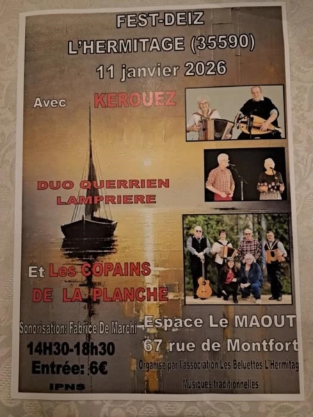 Date : Dimanche 11/01/2026 Horaires : 14h30 à 18h30 Tarifs : 6€ Organisateur : ASSOCIATION LES BELUETTES L'HERMITAGE Adresse de l'événement : ESPACE LE MAOUT 67 RUE DE MONTFORT 35590 L HERMITAGE Informations complémentaires : Animation : Kerouez, Duo Querrien-Lampierre, Les Copains de la Planche. Sonorisation : Fabrice De Marchi. Musiques traditionnelles. Danses pratiquées : Danse bretonne Référence de l'annonce : 58193