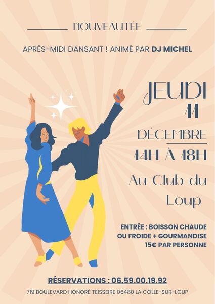 Date : Jeudi 11/12/2025 Horaires : 14h à 18h Tarifs : 15€ (boisson chaude ou froide + gourmandise incluses) Organisateur : CLUB DU LOUP Adresse de l'événement : CLUB DU LOUP 719 BOULEVARD HONORÉ-TEISSEIRE 06480 LA COLLE SUR LOUP Informations complémentaires : Animation : DJ Michel. Danses pratiquées : Danses de salon, Danses en ligne, Danses rétro Référence de l'annonce : 56403 call06 59 00 19 92