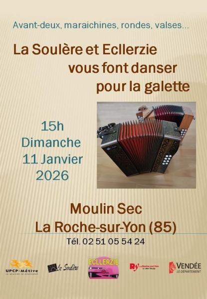 Date : Dimanche 11/01/2026 Horaires : 15h à 18h Organisateur : LA SOULÈRE Adresse de l'événement : MOULIN-SEC 85000 LA ROCHE SUR YON Danses pratiquées : Danses de salon, Danses en ligne, Danses rétro, Valse Référence de l'annonce : 61122 call02 51 05 54 24