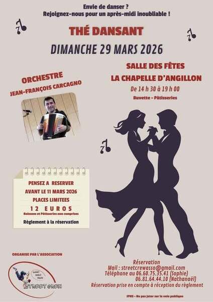 Date : Dimanche 29/03/2026 Horaires : 14h30 à 19h Tarifs : 12€ par personne (boissons et pâtisseries non comprises) Organisateur : ASSOCIATION SIMIL STREET CREW Adresse de l'événement : SALLE DES FÊTES 18380 LA CHAPELLE D ANGILLON Informations complémentaires : Animation : Orchestre Jean-François Carcagno. Réservation obligatoire avant le 11 mars 2026 (places limitées). Buvette et pâtisseries sur place. Règlement requis à la réservation pour validation. Danses : valses, tangos et danses en ligne. Danses pratiquées : Danses de salon, Danses en ligne (Line dance), Danses rétro, Tango, Valse Référence de l'annonce : 63296 call06 60 75 35 41call06 81 64 44 10