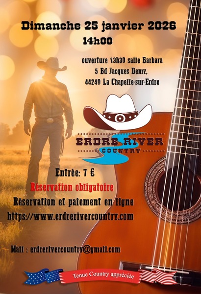 Date : Dimanche 25/01/2026 Horaires : 14h (ouverture 13h30) Tarifs : 7€ Organisateur : ERDRE RIVER COUNTRY Adresse de l'événement : SALLE BARBARA 5 BOULEVARD JACQUES DEMY 44240 LA CHAPELLE SUR ERDRE Informations complémentaires : Réservation obligatoire. Réservation et paiement en ligne. Tenue country appréciée. Danses pratiquées : Country Référence de l'annonce : 56997 call07 82 49 79 44