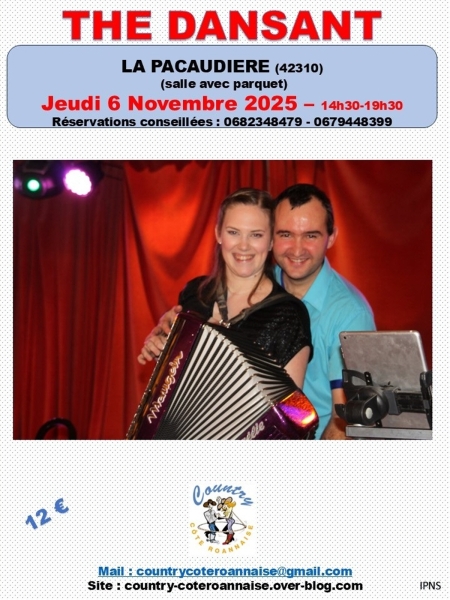 Date : 06/11/2025 (Événement passé) Horaires : 14h30 à 19h30 Tarifs : 12€ Organisateur : COUNTRY CÔTE ROANNAISE Adresse de l'événement : SALLE DES FÊTES RUE ANTOINETTE GRIMAUD 42310 LA PACAUDIERE Informations complémentaires : Animation : Aurélie et Jérôme Arnaud. Salle avec parquet. Réservations conseillées. Danses pratiquées : Country, Danses de salon, Danses en ligne, Danses rétro Référence de l'annonce : 51179 call06 12 30 37 95