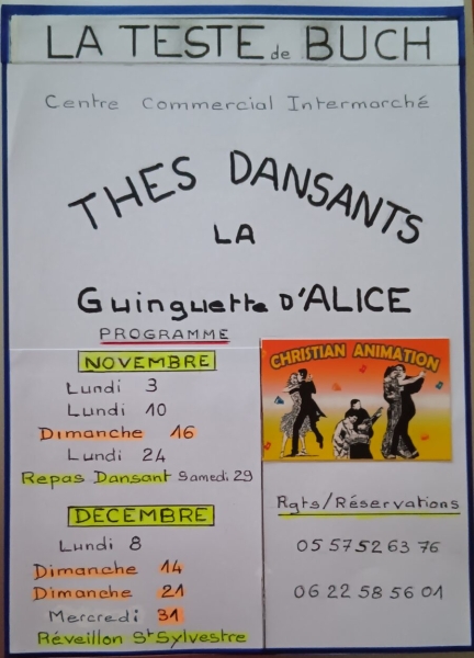 Dates : Lundi 03/11/2025, Lundi 10/11/2025, Dimanche 16/11/2025, Lundi 24/11/2025, Samedi 29/11/2025 (4 autres dates), Lundi 08/12/2025, Dimanche 14/12/2025, Dimanche 21/12/2025, Mercredi 31/12/2025 Tarifs : 11€ le lundi, 12€ le dimanche et férié Organisateur : LES COMPTOIRS D'ALICE Adresse de l'événement : LES COMPTOIRS D'ALICE CENTRE COMMERCIAL INTERMARCHÉ 33115 LA TESTE DE BUCH Informations complémentaires : Animation : Christian Animation. Ambiance paso, valse, rock, tango, etc. Réveillon de la Saint-Sylvestre.