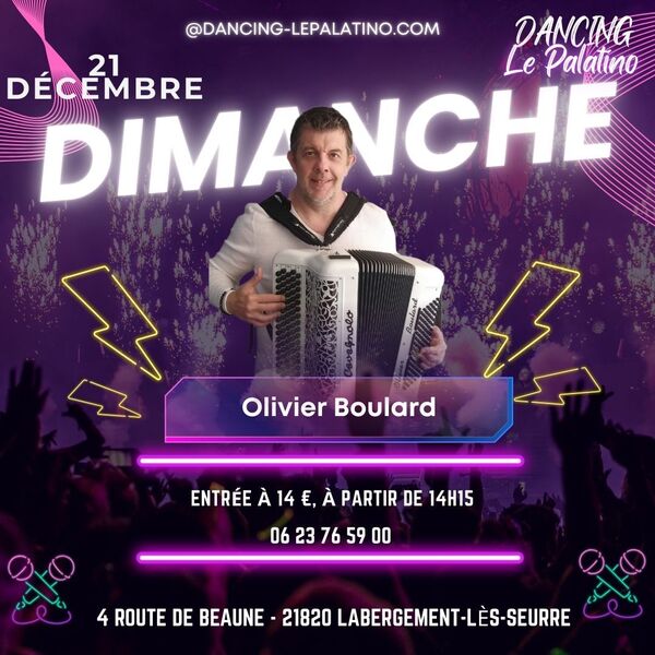 Date : Dimanche 21/12/2025 Horaires : 14h15 A 19h Tarifs : 14 euros Organisateur : LE PALATINO Adresse de l'événement : 4 ROUTE DE BEAUNE 21820 LABERGEMENT LES SEURRE Danses pratiquées : Danses de salon Référence de l'annonce : 57950 call06 23 76 59 00