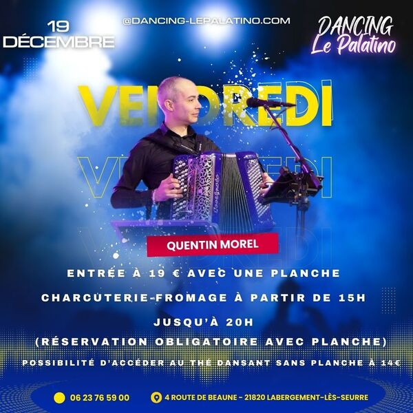Date : Vendredi 19/12/2025 Horaires : 15H A 20H Tarifs : 14 euros Organisateur : LE PALATINO Adresse de l'événement : 4 ROUTE DE BEAUNE 21820 LABERGEMENT LES SEURRE Danses pratiquées : Danses de salon Référence de l'annonce : 57949 call06 23 76 59 00