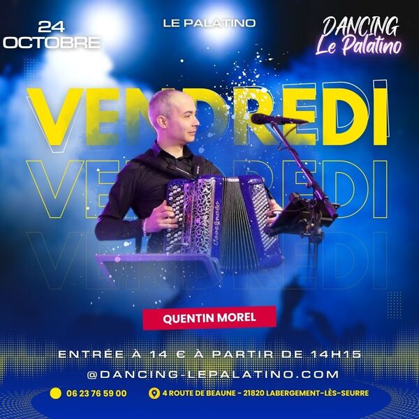 Date : Vendredi 24/10/2025 Horaires : 14h15 A 19h Tarifs : 14 euros Organisateur : LE PALATINO Adresse de l'événement : 4 ROUTE DE BEAUNE 21820 LABERGEMENT LES SEURRE Danses pratiquées : Danses de salon Référence de l'annonce : 53943 call06 23 76 59 00