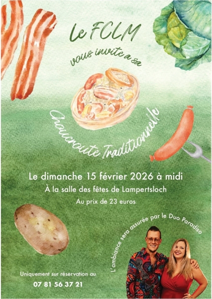 Date : Dimanche 15/02/2026 Horaires : 12h Tarifs : 23€ Organisateur : FC LAMPERTSLOCH-MERKWILLER Adresse de l'événement : SALLE DES FÊTES RUE DU STADE 67250 LAMPERTSLOCH Informations complémentaires : Animation : Duo Paradiso. Choucroute préparée sur place. Réservation obligatoire. Ambiance festive. Danses pratiquées : Danses de salon, Danses en ligne, Danses rétro Référence de l'annonce : 61473 call06 32 03 24 53call07 81 56 37 21