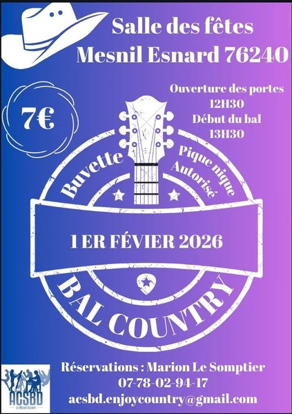 Date : Dimanche 01/02/2026 Horaires : 12H30-18h30 Tarifs : 7€ Organisateur : ACSBD Adresse de l'événement : SALLE DES FÊTES 76240 LE MESNIL ESNARD Danses pratiquées : Country Référence de l'annonce : 61776 call07 78 02 94 17