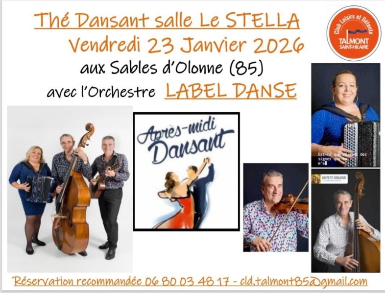 Date : Vendredi 23/01/2026 Horaires : 14h30 à 19h30 Tarifs : 11€ Organisateur : LOISIRS ET DÉTENTE Adresse de l'événement : SALLE LE STELLA 10 BOULEVARD DU SOUVENIR-FRANÇAIS 85100 LES SABLES D OLONNE Informations complémentaires : Animation : Orchestre Label Danse. Pause goûter à 17h. Réservation recommandée. Ouvert à tous. Danses pratiquées : Danses de salon, Danses en ligne, Danses rétro Référence de l'annonce : 61207 call06 31 43 43 20call06 80 03 48 17