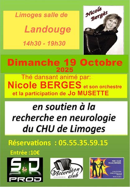 Date : Dimanche 19/10/2025 Horaires : 14h30-19h30 Tarifs : 10€ Organisateur : ACCORDÉON CLUB & FAN CLUB NICOLE BERGÈS Adresse de l'événement : SALLE DE LANDOUGE 87000 LIMOGES Informations complémentaires : Animation : Orchestre de Nicole Bergès et la participation de Jo Musette. En soutien à la recherche en neurologie du CHU de Limoges. Danses pratiquées : Danses de salon, Danses en ligne, Danses rétro Référence de l'annonce : 48732 call05 55 35 59 15