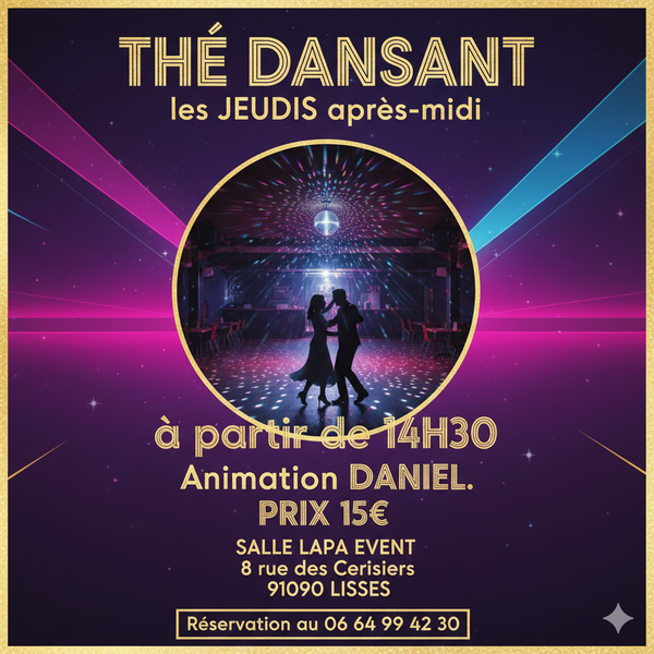 Date : Jeudi 11/12/2025 Horaires : 14H30 à 18H 30 Tarifs : 15€ avec boisson et goûter à 16h30 Organisateur : LAPA EVENT Adresse de l'événement : 8 RUE DES CERISIERS 91090 LISSES Informations complémentaires : ## 🎶 Thé Dansant Exceptionnel ! 🎶