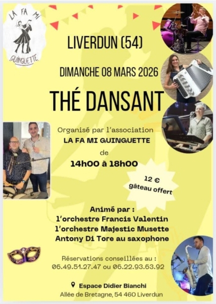 Date : Dimanche 08/03/2026 Horaires : de 14h à 18h Tarifs : 12€ Organisateur : LA FA MI GUINGUETTE Adresse de l'événement : ESPACE DIDIER BIANCHI ALLÉE DE BRETAGNE 54460 LIVERDUN Informations complémentaires : Animation : Orchestre Francis Valentin, Orchestre Majestic Musette, Antony Di Tore au saxophone. Part de gâteau offerte. Réservations conseillées. Danses pratiquées : Danses de salon, Danses en ligne (Line dance), Danses rétro Référence de l'annonce : 62902 call06 49 51 27 47call06 22 93 63 92