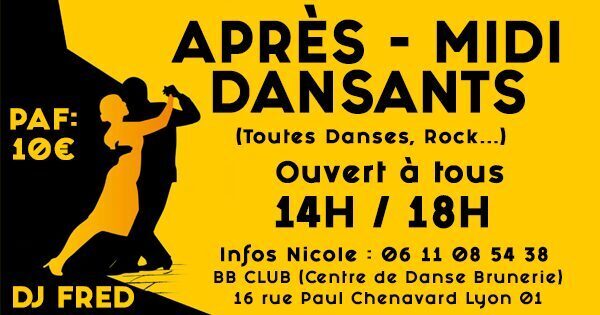 Dates : Samedi 08/11/2025, Samedi 22/11/2025, Samedi 06/12/2025, Samedi 20/12/2025, Samedi 03/01/2026 (12 autres dates), Samedi 17/01/2026, Samedi 31/01/2026, Samedi 07/02/2026, Samedi 21/02/2026, Samedi 07/03/2026, Samedi 21/03/2026, Samedi 04/04/2026, Samedi 18/04/2026, Samedi 02/05/2026, Samedi 16/05/2026, Samedi 30/05/2026, Samedi 13/06/2026 Horaires : 14h à 18h Tarifs : 10€ Organisateur : BB CLUB Adresse de l'événement : BB CLUB-CENTRE DE DANSE BRUNERIE 16 RUE PAUL CHENAVARD 69001 LYON 01 Informations complémentaires : Animation : DJ FRED. Toutes Danses, Rock. Ouvert à tous. Danses pratiquées : Danses de salon, Danses en ligne, Danses rétro, Rock Référence de l'annonce : 50154 call06 11 08 54 38