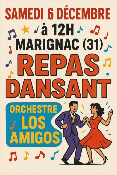 Date : Samedi 06/12/2025 Horaires : 12h Adresse de l'événement : 31440 MARIGNAC Informations complémentaires : Animation : Orchestre Los Amigos. Danses pratiquées : Danses de salon, Danses en ligne, Danses rétro Référence de l'annonce : 56930