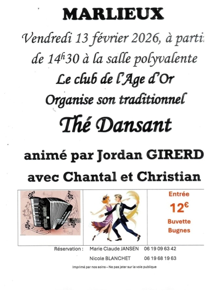 Date : 13/02/2026 (Événement passé) Horaires : 14h30 à 18h30 Tarifs : 12€ Organisateur : CLUB DE L'ÂGE D'OR Adresse de l'événement : SALLE DES FÊTES 01240 MARLIEUX Informations complémentaires : Animation : Jordan Girerd avec Chantal et Christian. Buvette. Bugnes. Accès adapté aux personnes à mobilité réduite. Danses pratiquées : Danses de salon, Danses en ligne (Line dance), Danses rétro Référence de l'annonce : 62523 call07 49 31 41 04