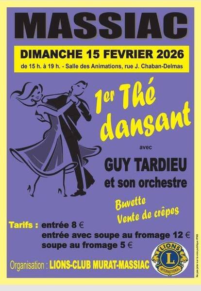 Date : Dimanche 15/02/2026 Horaires : 15h à 19h Tarifs : Entrée 8€ / soupe au fromage 5€ / entrée + soupe 12€ Organisateur : LIONS CLUB MURAT-MASSIAC Adresse de l'événement : SALLE DES ANIMATIONS RUE J. CHABAN-DELMAS 15500 MASSIAC Informations complémentaires : Animation : Guy Tardieu et son orchestre. Buvette. Vente de crêpes. Danses pratiquées : Danses de salon, Danses en ligne (Line dance), Danses rétro Référence de l'annonce : 63201