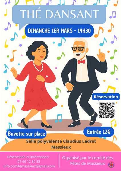 Date : Dimanche 01/03/2026 Horaires : 14h30 Tarifs : 12€ Organisateur : COMITÉ DES FÊTES DE MASSIEUX Adresse de l'événement : 783 ROUTE DE REYRIEUX 01600 MASSIEUX Informations complémentaires : Thé dansant-Dimanche 1er mars