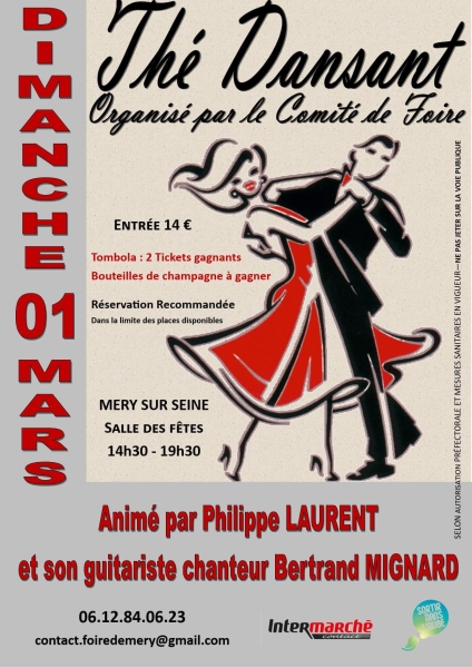 Date : Dimanche 01/03/2026 Horaires : 14h30 à 19h30 Tarifs : 14€ Organisateur : COMITÉ DE FOIRE Adresse de l'événement : SALLE DES FÊTES RUE DU COLONEL FOSSOYEAUX 10170 MERY SUR SEINE Informations complémentaires : Animation : Philippe Laurent et Bertrand Mignard. Tombola avec 2 tickets gagnants, bouteilles de champagne à gagner. Réservation conseillée avant le 23 février. Ambiance garantie. Dans la limite des places disponibles. Danses pratiquées : Danses de salon, Danses en ligne (Line dance), Danses rétro Référence de l'annonce : 63785 call06 12 84 06 23