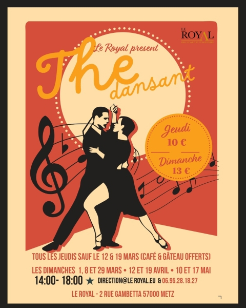 Date : Jeudi 05/03/2026 Horaires : 14h-18h Tarifs : 10€ Organisateur : LE ROYAL Adresse de l'événement : LE ROYAL 2 RUE GAMBETTA 57000 METZ Informations complémentaires : Ouverture des portes dès 13h30. Après-midi dansant pour les amoureux des danses à deux. Café et gâteau offerts les jeudis (hors 12 et 19 mars). Danses pratiquées : Danses de salon, Danses en ligne (Line dance), Danses rétro Référence de l'annonce : 64404 call06 95 28 18 27