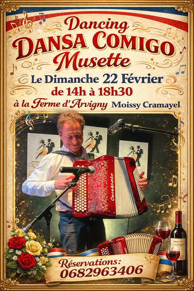Dates : Dimanche 01/03/2026, Dimanche 08/03/2026, Dimanche 15/03/2026, Dimanche 22/03/2026, Dimanche 29/03/2026 (39 autres dates), Dimanche 05/04/2026, Dimanche 12/04/2026, Dimanche 19/04/2026, Dimanche 26/04/2026, Dimanche 03/05/2026, Dimanche 10/05/2026, Dimanche 17/05/2026, Dimanche 24/05/2026, Dimanche 31/05/2026, Dimanche 07/06/2026, Dimanche 14/06/2026, Dimanche 21/06/2026, Dimanche 28/06/2026, Dimanche 05/07/2026, Dimanche 12/07/2026, Dimanche 19/07/2026, Dimanche 26/07/2026, Dimanche 02/08/2026, Samedi 08/08/2026, Samedi 15/08/2026, Dimanche 23/08/2026, Dimanche 30/08/2026, Dimanche 06/09/2026, Dimanche 13/09/2026, Dimanche 20/09/2026, Dimanche 27/09/2026, Dimanche 04/10/2026, Dimanche 11/10/2026, Dimanche 18/10/2026, Dimanche 25/10/2026, Dimanche 01/11/2026, Dimanche 08/11/2026, Dimanche 15/11/2026, Dimanche 22/11/2026, Dimanche 29/11/2026, Dimanche 06/12/2026, Dimanche 13/12/2026, Dimanche 20/12/2026, Dimanche 27/12/2026 Horaires : Nouveau *****de 14h à 18h30 ***** Tarifs : 15€ avec buffet á 17h mais boissons payantes Organisateur : DANSA COMIGO? Adresse de l'événement : FERME D'ARVIGNY ALLÉE EDOUARD BRANLY 77550 MOISSY CRAMAYEL Informations complémentaires : Dans une belle salle chauffée et climatisée, venez passer de bons après-midis dansants sur une grande piste de danse parquetée