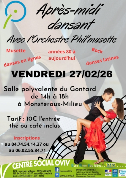 Date : Vendredi 27/02/2026 Horaires : 14h à 18h Tarifs : 10€ l'entrée Organisateur : CENTRE SOCIAL OVIV-FAMILLES/SENIORS Adresse de l'événement : SALLE DES FÊTES DU GONTARD 110 CHEMIN DES HAIES 38122 MONSTEROUX MILIEU Informations complémentaires : Animation : Orchestre Phil'musette. Danses : musette, danses en ligne, années 80 à aujourd'hui, rock, danses latines. Thé ou café inclus. Inscriptions obligatoires. Salle polyvalente du Gontard. Danses pratiquées : Danses de salon, Danses en ligne (Line dance), Danses latino, Danses rétro, Disco, Rock Référence de l'annonce : 62713 call04 74 54 14 37call06 02 55 84 71
