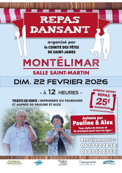 Date : Dimanche 22/02/2026 Horaires : 12h Tarifs : 25€ Organisateur : COMITÉ DES FÊTES DE SAINT-JAMES Adresse de l'événement : SALLE SAINT-MARTIN 26200 MONTELIMAR Informations complémentaires : Animation : Pauline & Alex. Apéritif offert. Boissons non comprises. Tickets en vente à l'Imprimerie du Faubourg et auprès de Pauline et Alex. Tous styles de danses et de musiques pour tous les âges. Danses pratiquées : Danses de salon, Danses en ligne (Line dance), Danses rétro Référence de l'annonce : 61775 call06 70 12 78 38call06 81 50 07 51